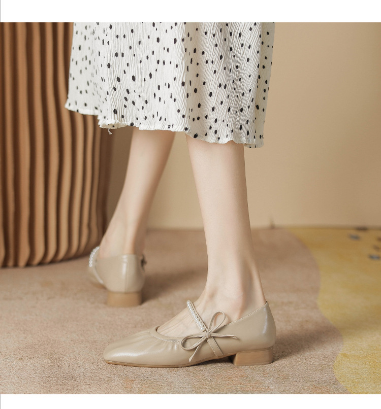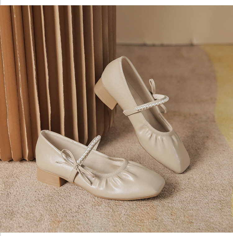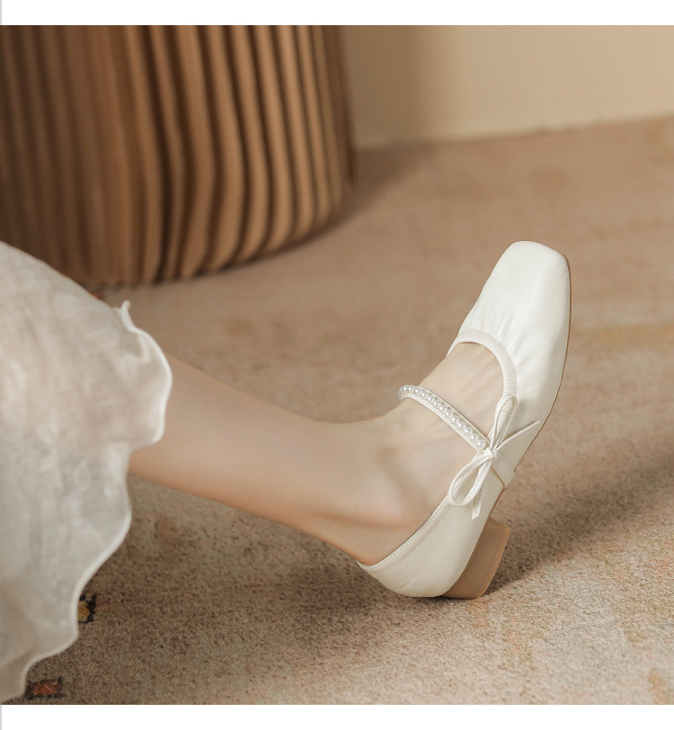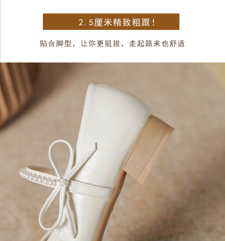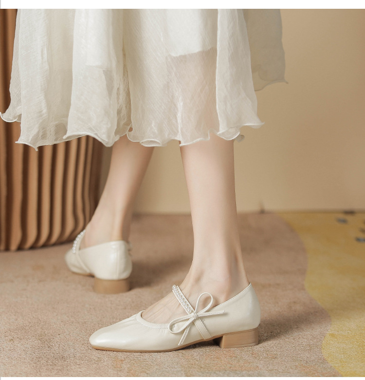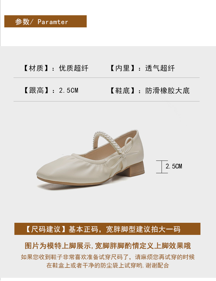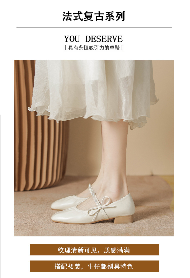 单鞋女2023年秋季新款方头粗跟奶奶鞋女仙女风珍珠蝴蝶结软底单鞋