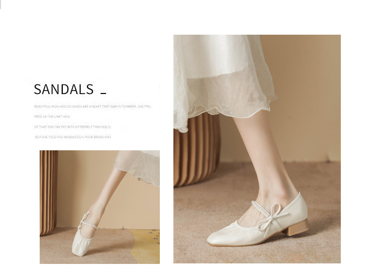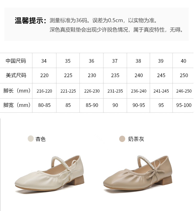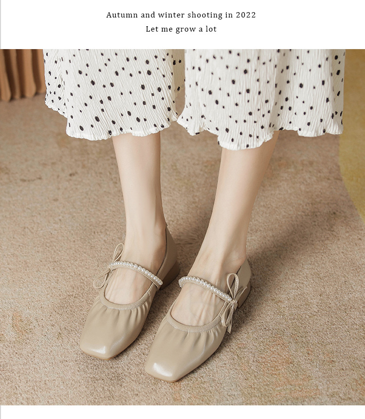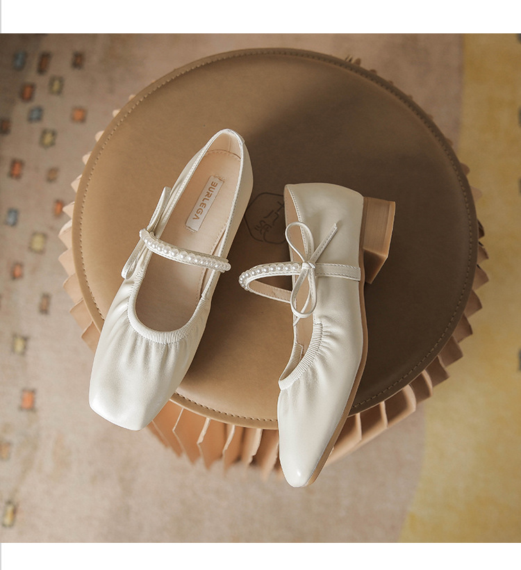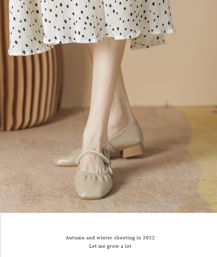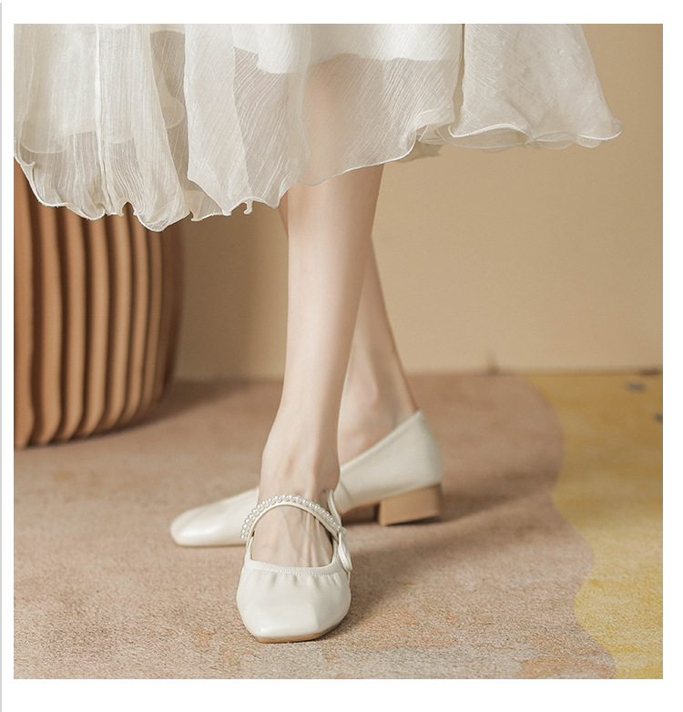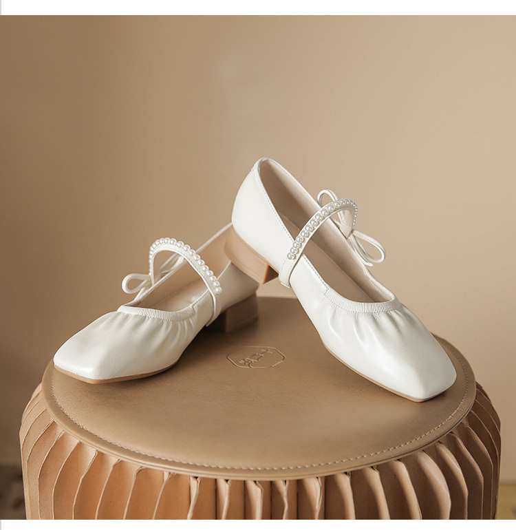 单鞋女2023年秋季新款方头粗跟奶奶鞋女仙女风珍珠蝴蝶结软底单鞋